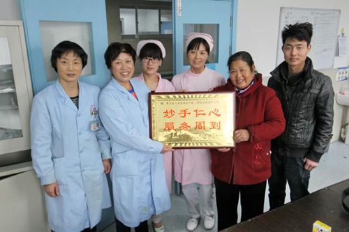 史金鳳帶著“兒子”龐小明為醫(yī)院婦產(chǎn)科醫(yī)護(hù)人員送牌匾表達(dá)謝意。