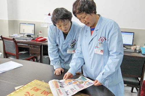 醫(yī)護(hù)人員翻看報(bào)紙上有關(guān)聾啞學(xué)校以及校長(zhǎng)史金鳳的報(bào)道。